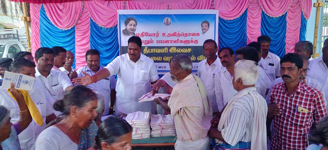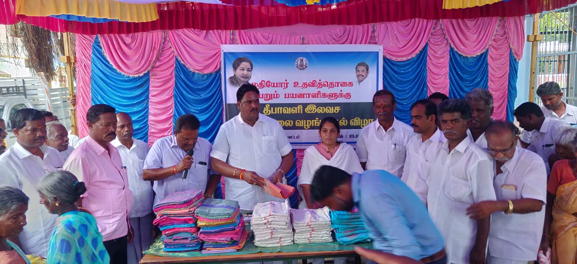 தீபாவளியை முன்னிட்டு தமிழக அரசு வழங்கும் முதியோர் உதவித் தொகை பெறும் பயனாளிகளுக்கான இலவச சேலை வேட்டி வழங்கும் நிகழ்ச்சி ஆரணி அடுத்த படவேட்டில் நடந்தது. இதில் RDO மைதிலி, கலசப்பாக்கம் எம்எல்ஏ பன்னீர்செல்வம் ஆகியோர் பயனாளிகளுக்கு இலவச சேலை வேட்டிகளை வழங்கினர்.
